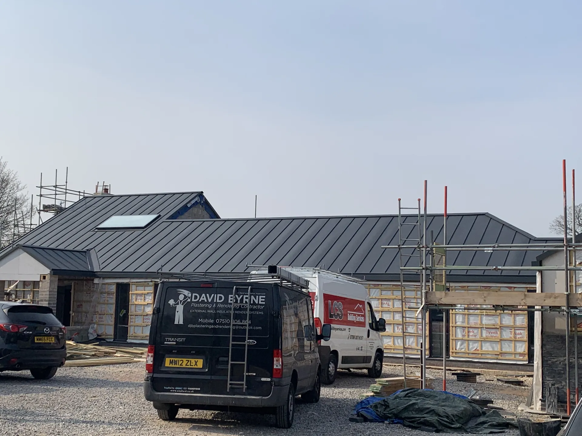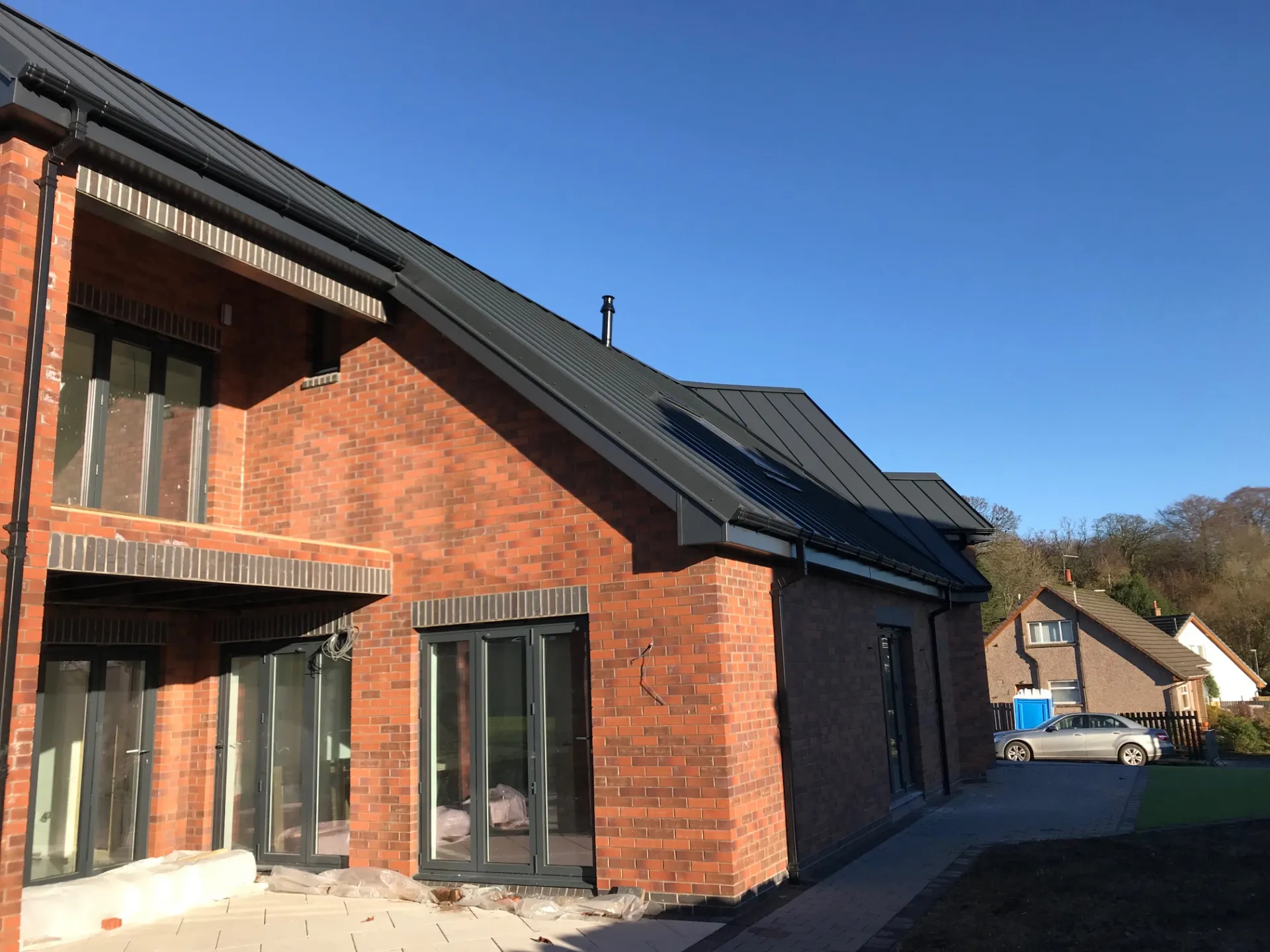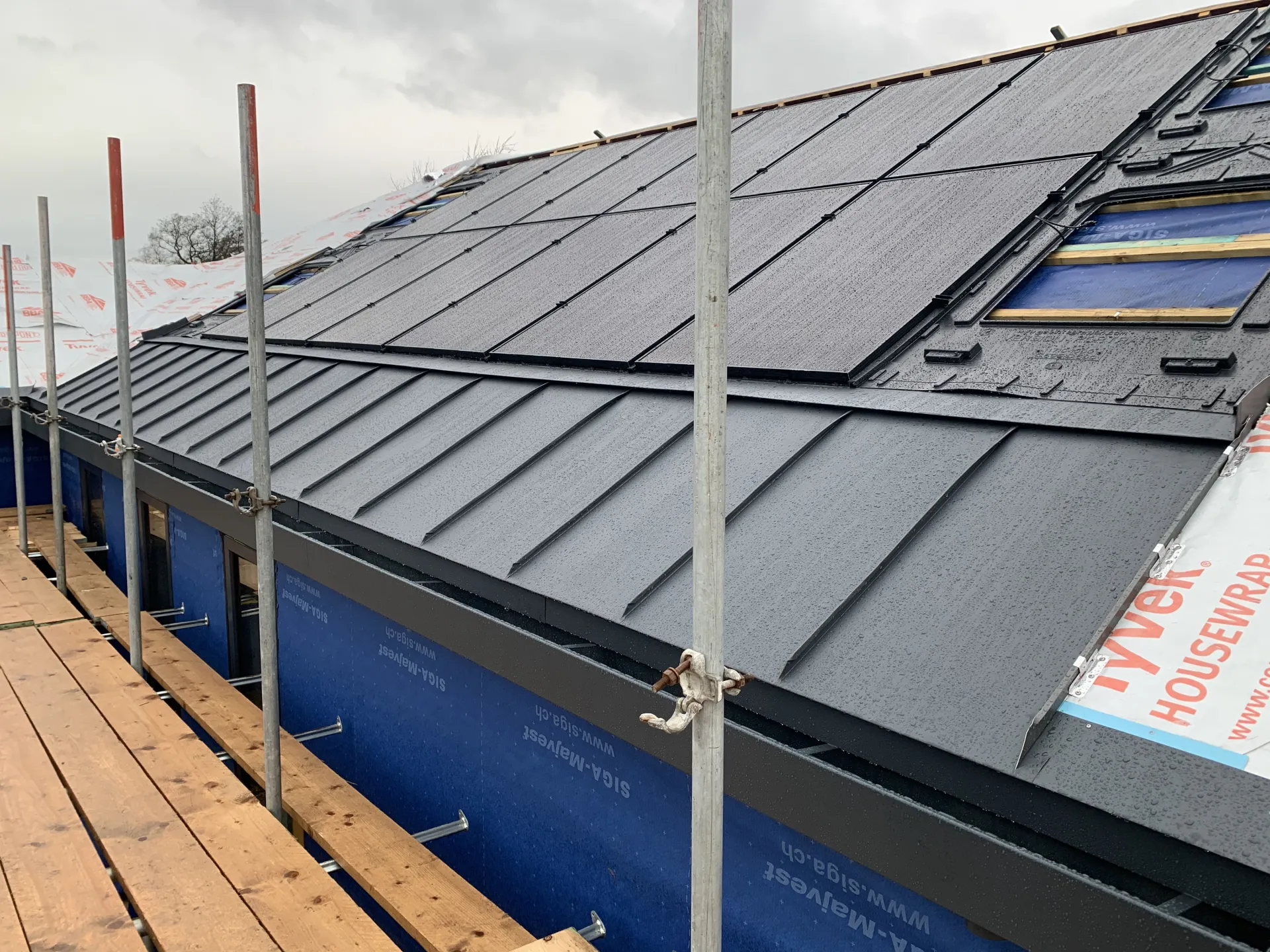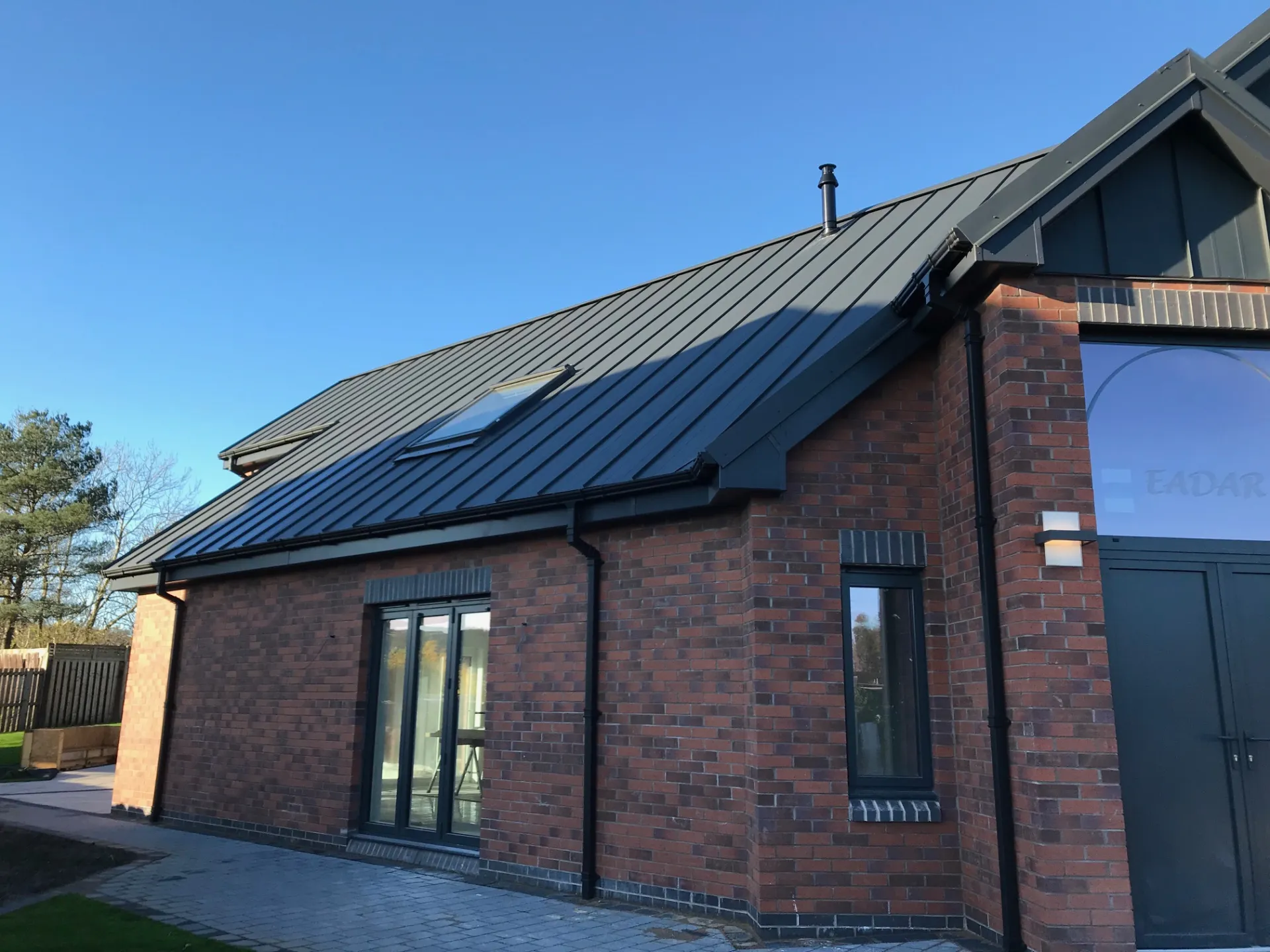 A flush fitting PV system was a big part of the build as well as several rooflights which were all fitted superbly in combination with the standing seam profile. All accompanying valleys and flashings were also skilfully formed on site. The customer is very happy with the finish and the final result.