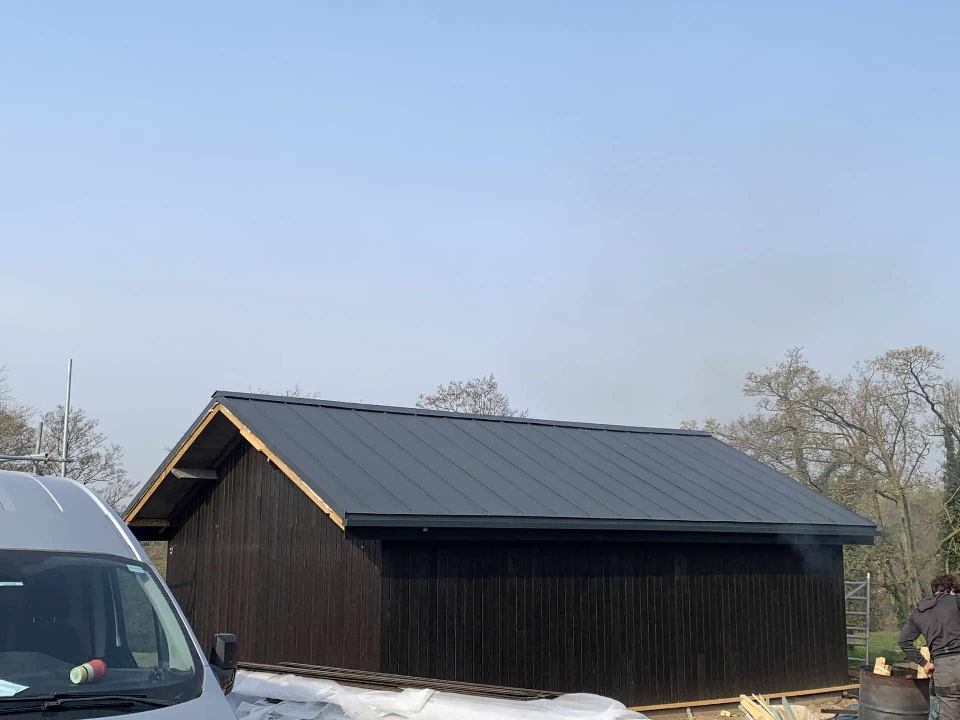 One of our trusted fitters completed this job in East Sussex on a large Annexe. Finished in Textured 0.6mm steel in Anthracite Grey as it was being fitted to battens. It replaced a corrugated roof, and looks amazing against the wooden cladding below.