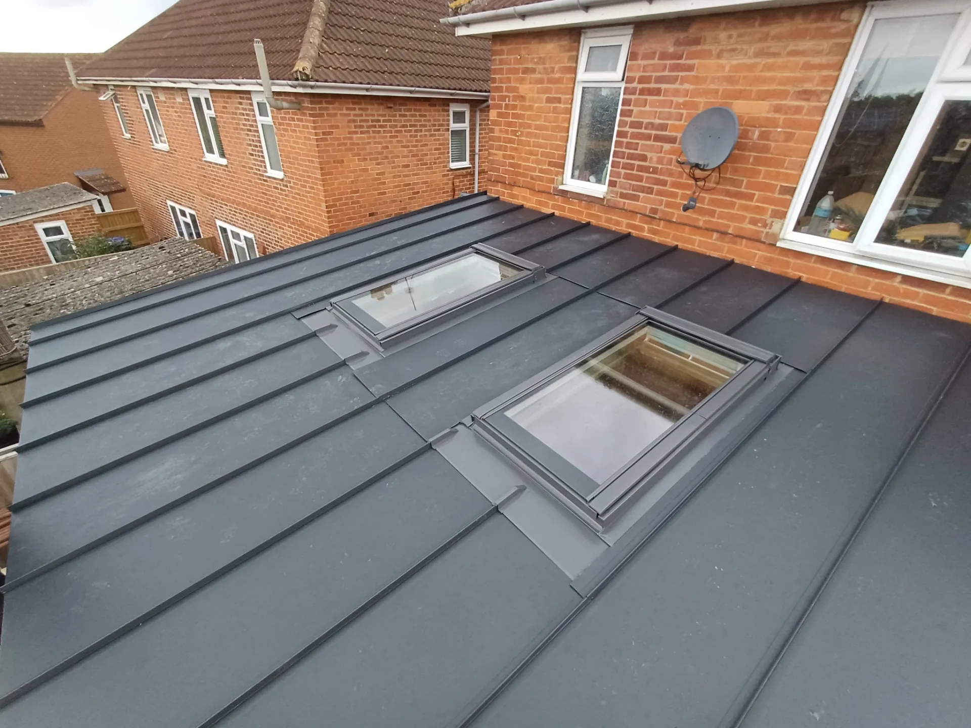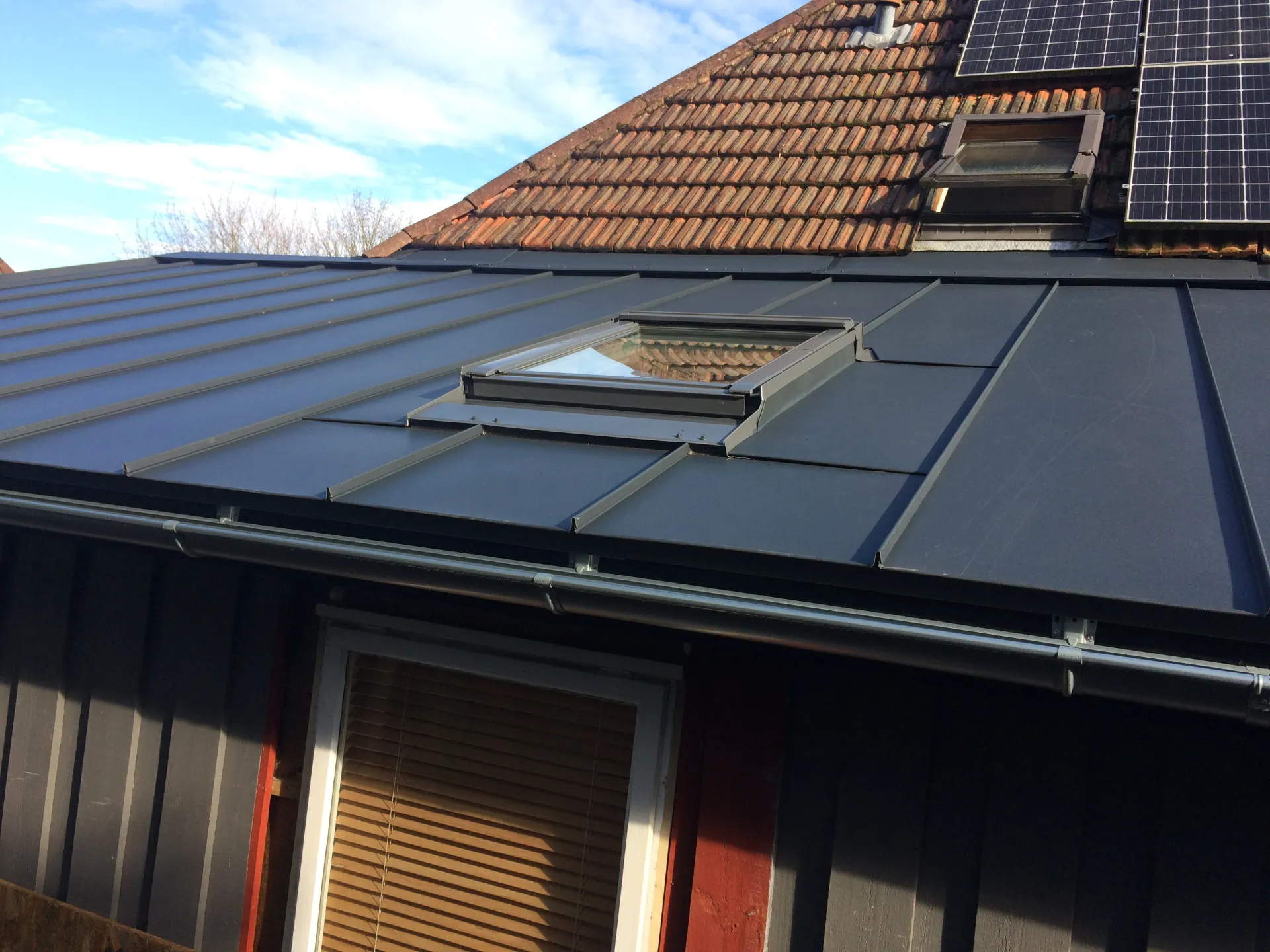 This monopitch extension was finished in Comax Klik Steel standing seam in a matt finish Anthracite Grey. Supplied through one of our trusted merchants, the client fitted the roof himself including the Velux rooflights with accompanying EDQ flashing kits. A classy finish to this extra space.