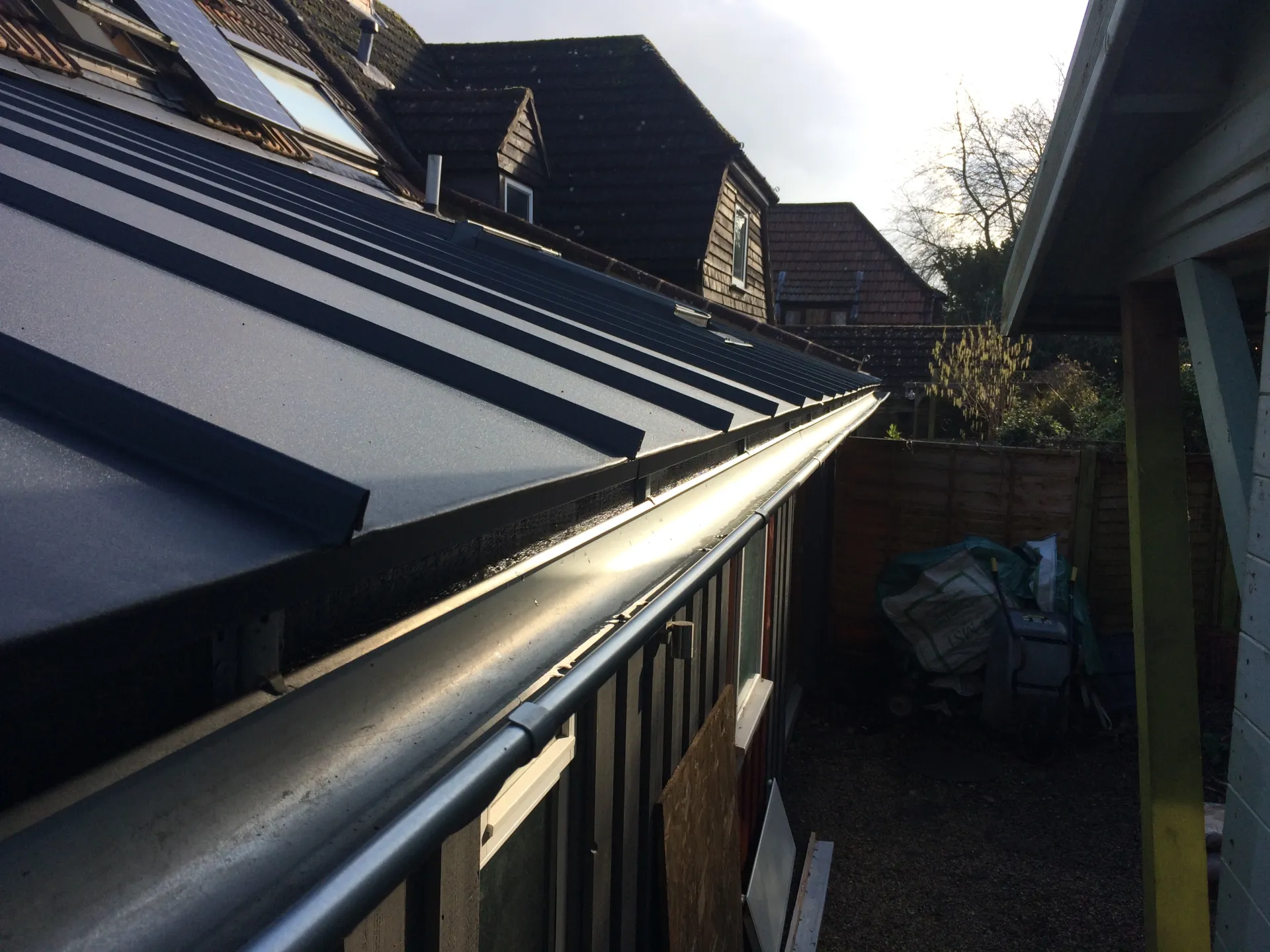 The client was after a Zinc effect roof, and decided to use our Easy Fit Klik Standing Seam system. We supplied our Textured Anthracite sheets in Aluminium with a matching gutter system also, that carries the same 50 year warranty. The fitter did a superb job and it resulted in the lovely clean finish you can see.